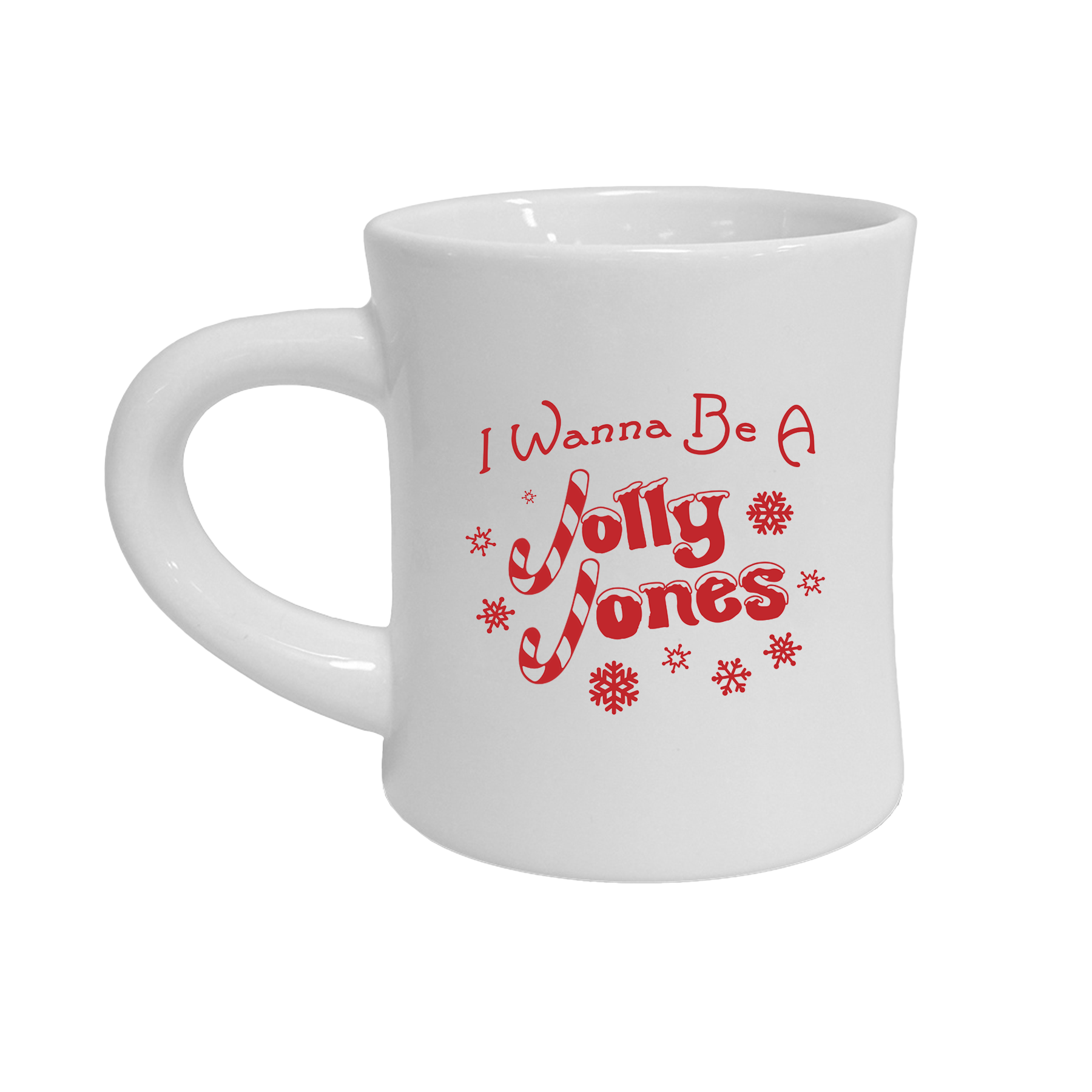 Jolly Jones design on a white ceramic diner mug. Microwave safe.
